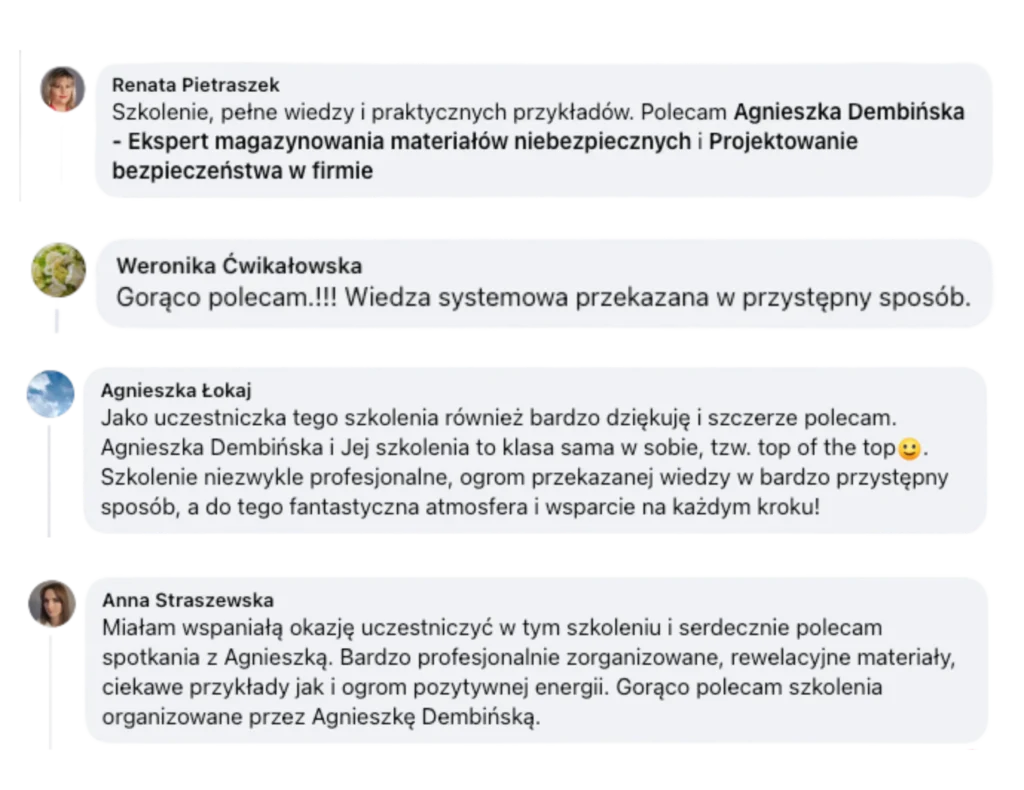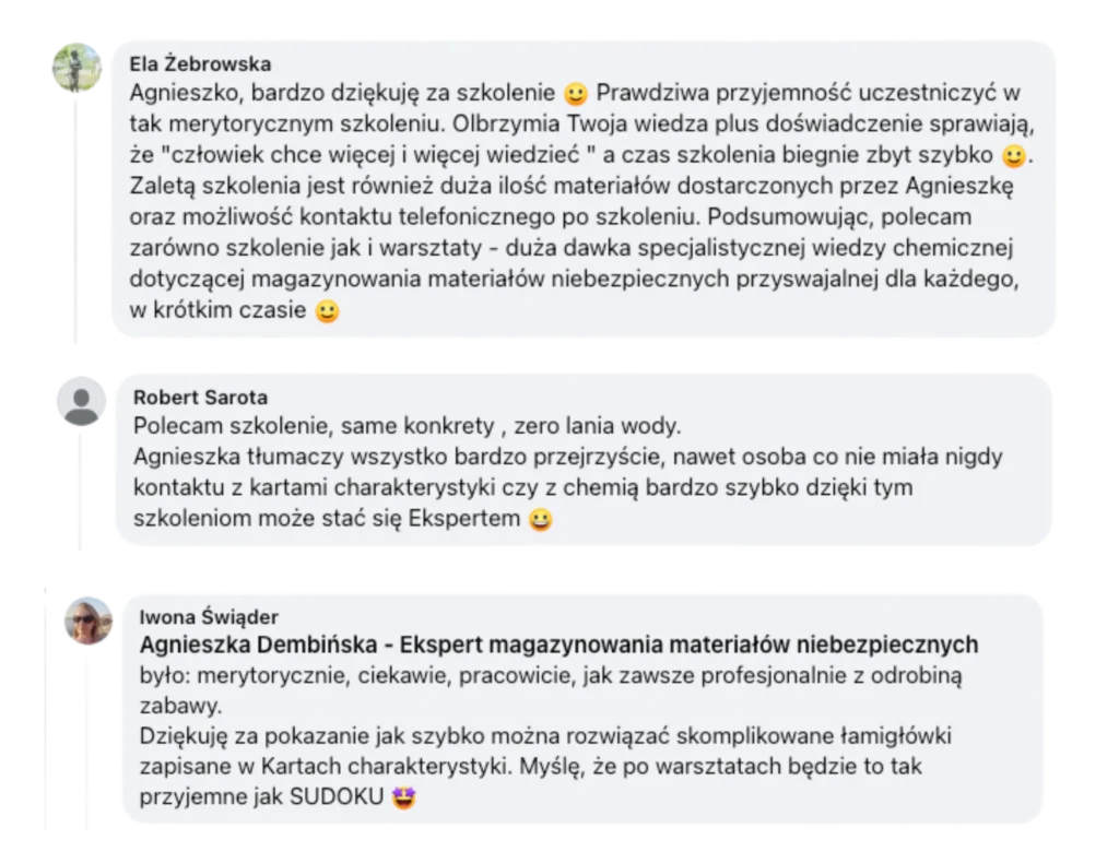 Z mojego szkolenia: „Magazynowanie materiałów niebezpiecznych. Jak wyposażyć magazyn chemiczny łącząc wymagania prawne z praktycznym podejściem” skorzystało już ponad 1000 specjalistów.